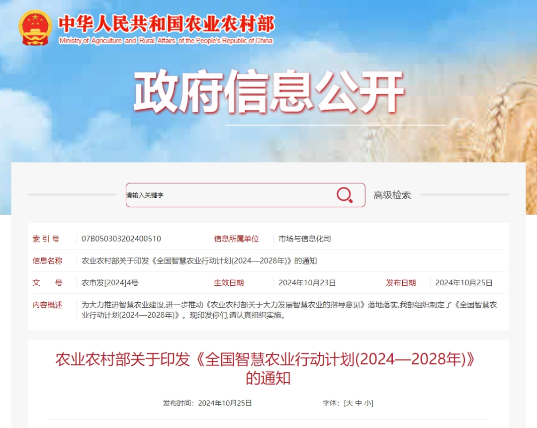 隨著(zhù)數字技術(shù)與實(shí)體經(jīng)濟深度融合,我國農業(yè)正加速向以數據為核心驅動(dòng)力的4.0時(shí)代轉型升級。農業(yè)農村部《全國智慧農業(yè)行動(dòng)計劃(2024—2028年)》出臺后,為農業(yè)現代化擘畫(huà)了更清晰路徑,推動(dòng)農業(yè)生產(chǎn)從“經(jīng)驗主導”向“數據賦能”跨越式發(fā)展。